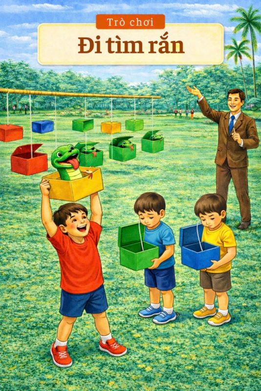 Mục tiêu: Sự quan sát, yếu tố may mắn. Số người tham gia: Mỗi đội 3 người. Dụng cụ: 2 cây treo ngang. Các hộp treo có thể giật dây để mở hộp, chia thành 2 loại hộp: có rắn và không có rắn. chuẩn bị ít nhất 20 hộp, trong đó có 10 hộp có rắn. (số lượng hộp phụ thuộc vào bao nhiêu đội chơi). Không gian chơi: một khoảng sân đủ rộng. Cách chơi: Từng người lên để chọn một cái hộp được treo trên cây. Sau khi chọn xong cầm dây giật mạnh xuống để hộp...