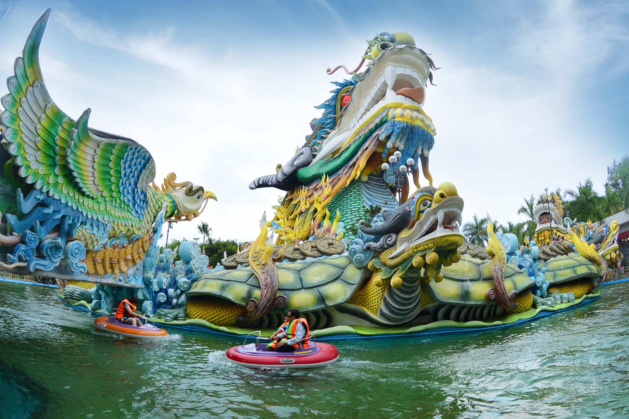 Những công trình mang chủ đề chính “Trở về cội nguồn văn hóa dân tộc”: Đền thờ vua Hùng, Tứ Linh hội tụ Long – Lân – Quy – Phụng, Đại cung Phụng Hoàng Tiên… giúp khơi gợi trong mỗi du khách đặt chân đến tham quan lòng yêu nước, niềm tự hào dân tộc. Du khách có thể tham quan và cầu nguyện, mong mọi điều may mắn đến với mình và gia đình tại nhiều công trình văn hóa tâm linh như Núi- đền thờ Bảy Cô Tiên, Cây Ước Nguyện hơn 300 tuổi, Long Hoa Thiên Bảo, quảng trường Phật Địa Mẫu, Thánh Tượng Quán Thế Âm Thiên Phủ Thiên Nhãn. Những công trình vui chơi hiện đại đem đến cho du khách những khoảnh khắc giải trí ấn tượng: Lâu Đài Pháp Thuật, Tàu Lượn Siêu Tốc, Đĩa Bay Hành Tinh Lạ… Trong đó nổi bật nhất là biển Tiên Đồng Ngọc Nữ – Đại dương xanh giữa lòng Sài Gòn. Đến đây, du khách được hòa mình trong không gian rực rỡ sắc màu, tận hưởng sự mát mẻ và thỏa sức vui đùa cùng những đợt sóng biển lên đến 1 mét, những trò chơi cảm giác mạnh dưới nước cực đã với đường trượt hàm rồng và thần ngư đầy thú vị.