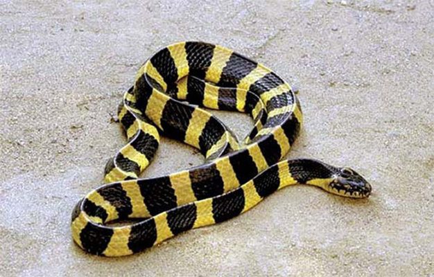 Rắn cạp nong – loài rắn cực độc với thân khoang đen vàng nổi bật, thường hoạt động về đêm và sống ở vùng núi hoặc gần sông suối.
