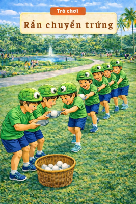 Cách chơi: Các đội đứng thành hàng ngang. Người bắt đầu sẽ dùng thìa lấy trứng trong giỏ, lần lượt chuyền ‘trứng’ bằng thìa đến người cuối cùng sẽ bỏ trứng vào giỏ.